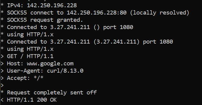 curl -x socks5://sockrouter:sockrouter@3.27.241.211:1080 -L http://google.com -v